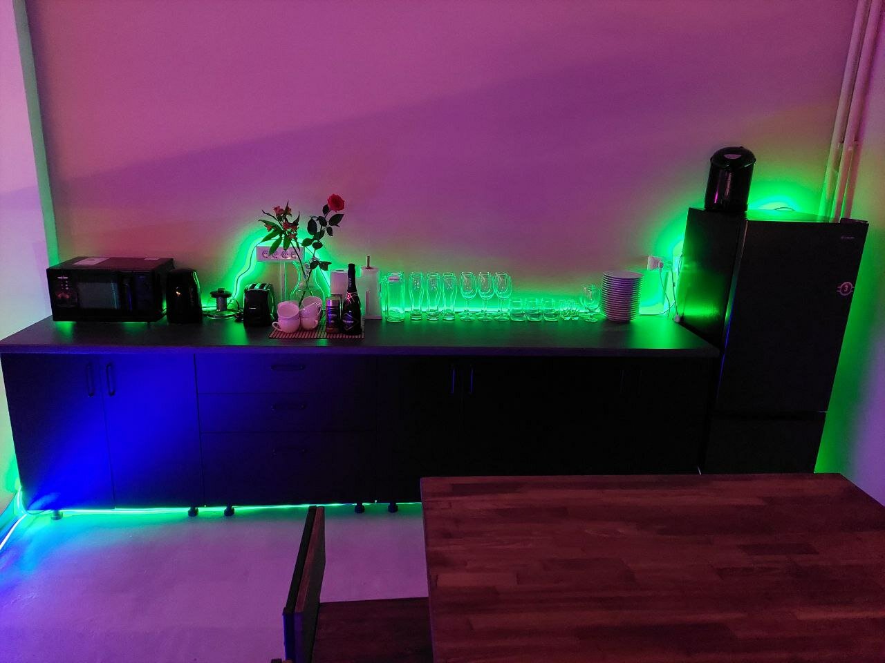 Для мероприятия есть : бокалы для вина и шампанского, стаканы, чайник , кофейник, кулер ,зона отдыха, музыкальная система, барная стойка, циклорама для фотосессии, качель, холодильник